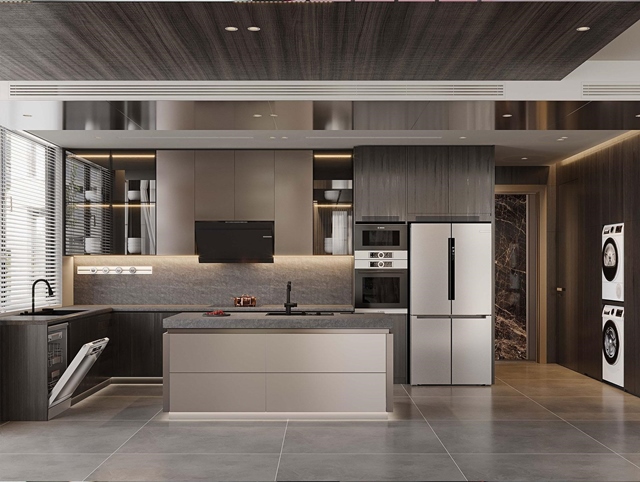 Không gian bếp cao cấp, bố trí đồng bộ máy rửa bát