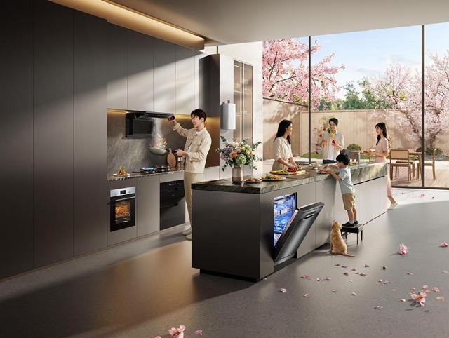 Không gian bếp mở, máy rửa bát hoạt động trong khi gia đình sinh hoạt bình thường