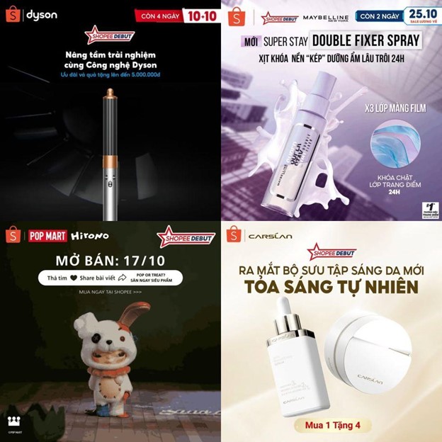 Từ những thương hiệu làm đẹp quốc dân như Maybelline, L’Oréal Paris, d'Alba cho đến những tên tuổi lớn trong ngành gia dụng cao cấp như Dyson, đều đã tận dụng kênh Shopee Debut để ghi dấu ấn cho dòng sản phẩm mới của mình.