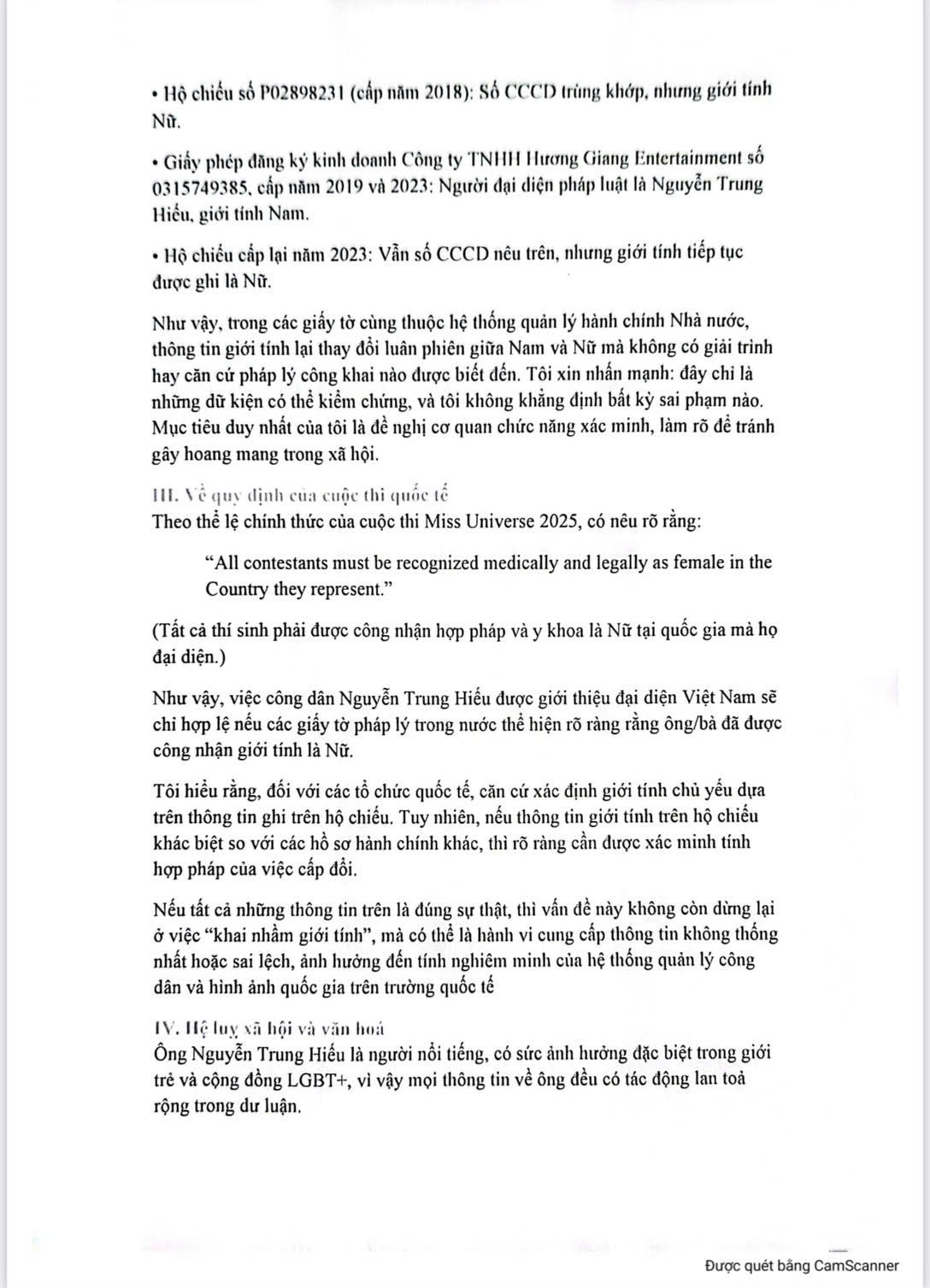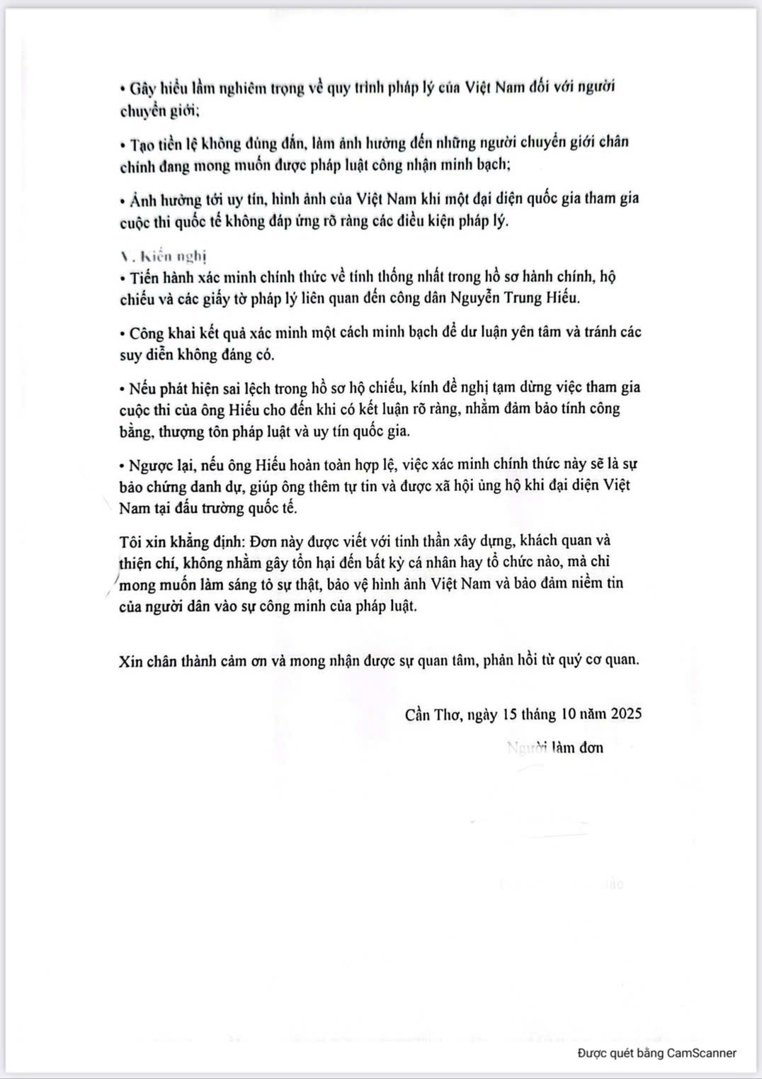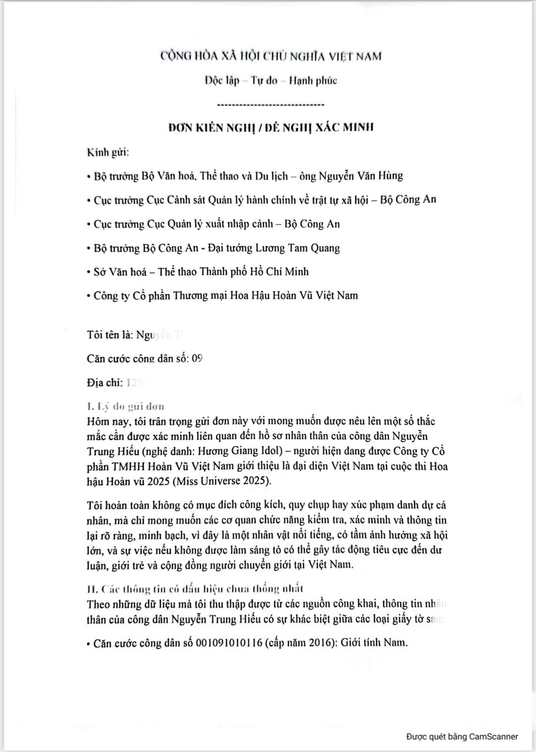 Dư luận đang xôn xao trước một đơn kiến nghị chính thức, đề nghị cơ quan chức năng kiểm tra và xác minh tính thống nhất trong hồ sơ nhân thân của công dân Nguyễn Trung Hiếu (tức Hoa hậu Hương Giang), người được giới thiệu là đại diện Việt Nam tại Miss Universe 2025.